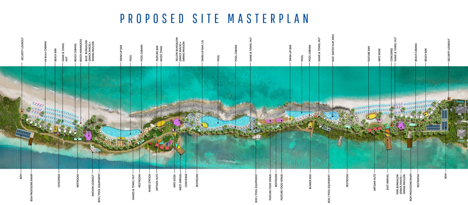 K vybaveniu budú patriť tri bazény, vodné swim-up bary, lehátka so slnečníkmi, toalety, prezliekárne, stravovacie možnosti, informačné kiosky súkromné bungalowy. Projekt sa zámerne vyhýba budovaniu nadmorských štruktúr, aby sa čo najviac znížilo narušenie životného prostredia a zachovali sa morské biotopy. Bude taktež implementovaná moderná čistiareň odpadových vôd a cieľom je nulový odpad na skládku.