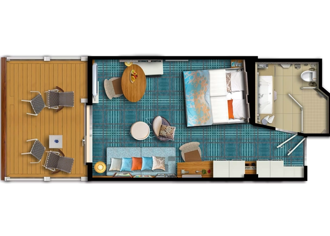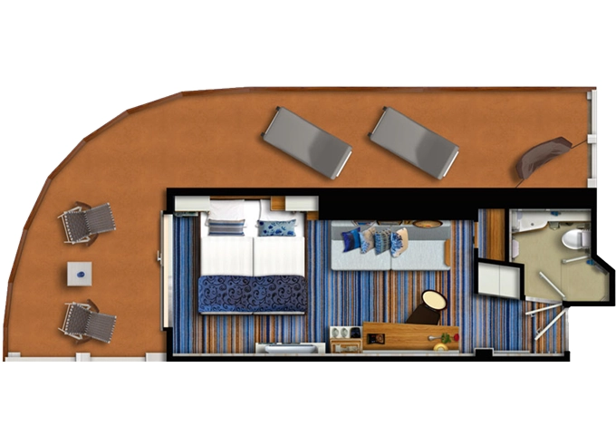 | VEPO - Kajuta s terasou Premium 17 m² + balkón 30 m² s 2 kreslami, 2 ležadlami a hojdacou sieťou. 7-11. paluba. Max 3 osoby. | 6 268 € 6 268 € za osobu | ||