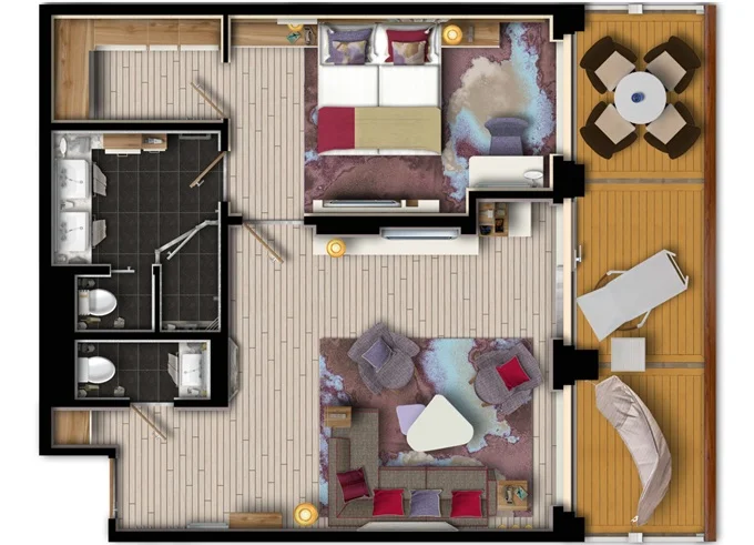 | SUTO - Themen Suite 54 m² + balkón 15 m² so stolom, ležadlom a hojdacou sieťou. Spálňa, obývacia časť, šatník. 10. paluba. Max 4 osoby. Výhody Suite. | 23 397 € 7 799 € za osobu | ||